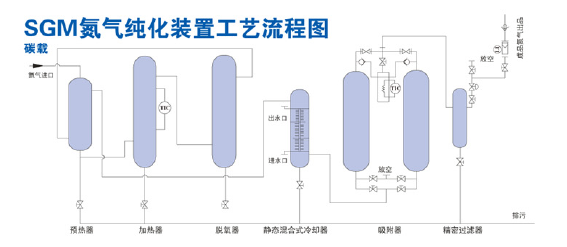 氮?dú)饧兓盗醒b置 氣體純度:≥99.9995% 氧含量:≤2ppm 二氧化碳含量:≤1ppm 露點(diǎn):≤-60℃ 技術(shù)特點(diǎn): 若用戶(hù)所需氮?dú)鈸?biāo)大于99.999%時(shí),在我公司制氮機(jī)設(shè)備的基礎(chǔ)上配置純化設(shè)備。本系列產(chǎn)品采用碳載脫氧催化劑,不需消耗氫氣源,碳與氮?dú)庵械挠嘌醴磻?yīng)生成二氧化碳,再采用變壓吸附工藝除去二氧化碳和水,經(jīng)過(guò)濾后得到高純度氮吸附工藝除去二氧化碳和水,經(jīng)過(guò)濾后得到高純度氮?dú)狻8呒兌鹊獨(dú)饧夹g(shù)指標(biāo)可達(dá)O2≤2ppm,CO2≤1ppm,露點(diǎn)≤-60℃。